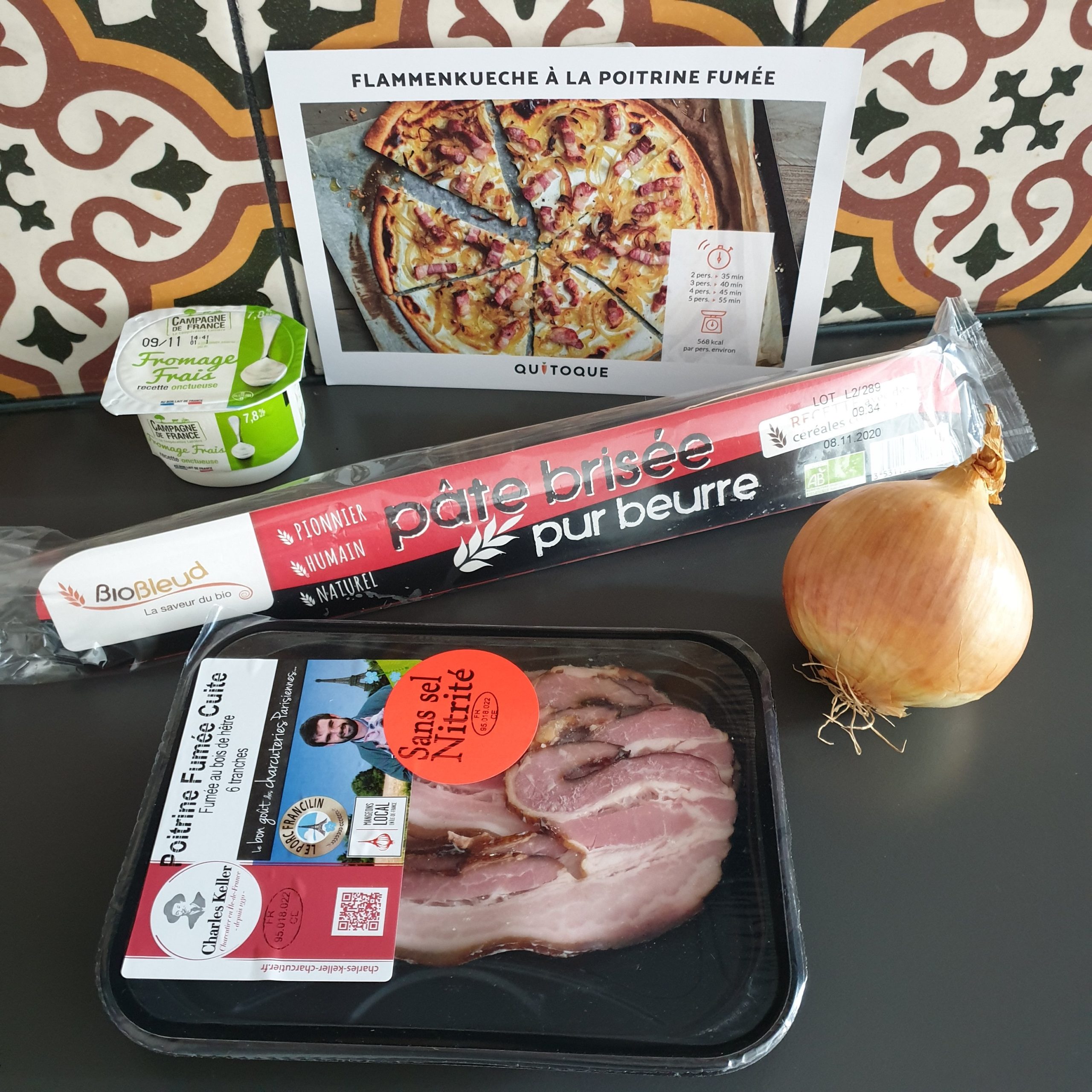 Aujourd’hui j’ai reçu une commande Quitoque et je me suis directement lancée dans la préparation d’une flammenkueche à la poitrine fumée. Puisque je me suis régalée, j’ai décidé de vous donner cette petite recette. Vous allez voir, il n’y a vraiment pas plus simple et rapide à préparer !