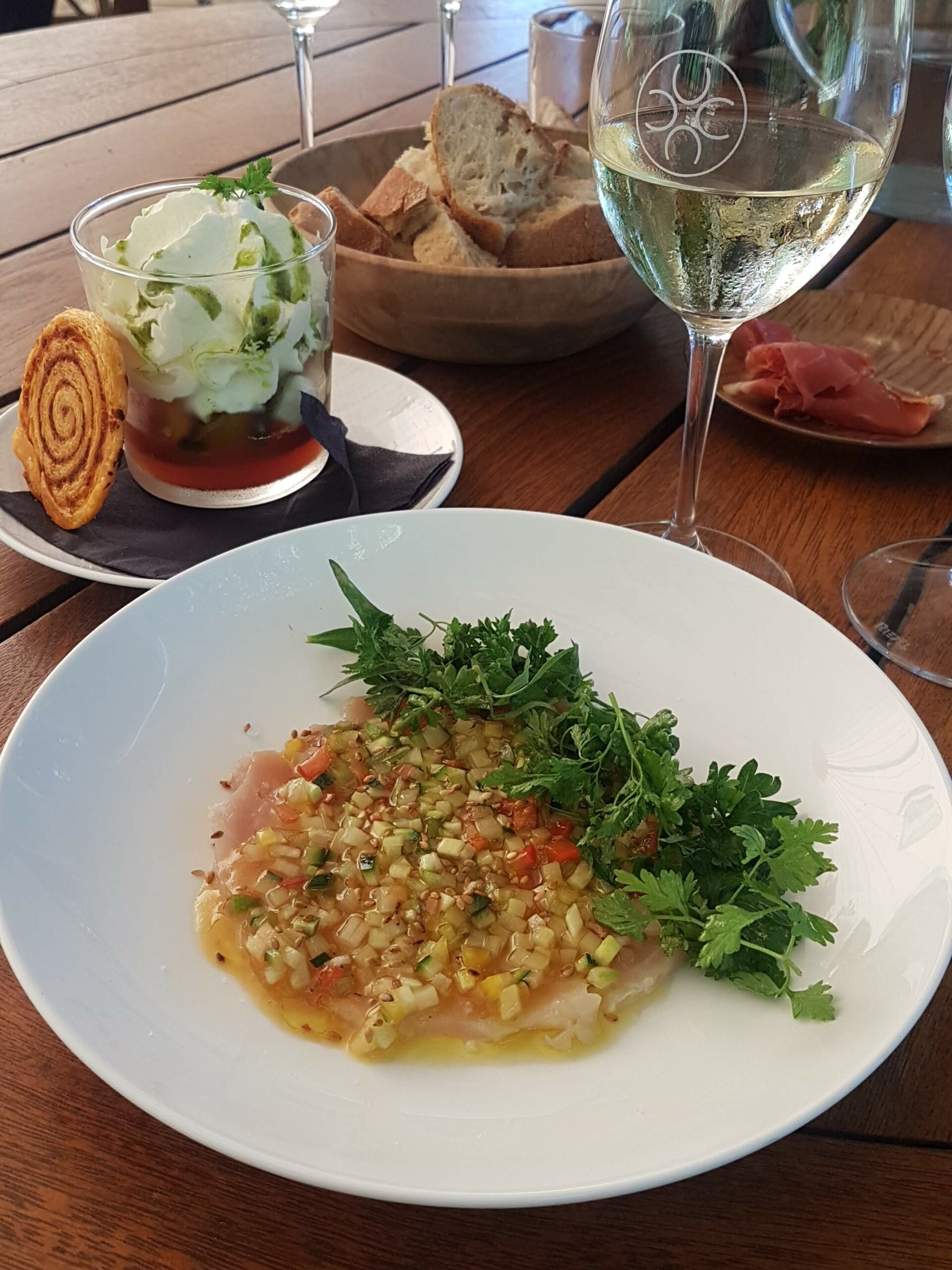 Pour clôturer ce blogtrip, direction Léognan pour profiter d’un excellent déjeuner bistronomique ! C’est donc en terrasse du restaurant Le Manège que nous nous sommes installés pour déguster le menu des saveurs à 38 € (le tout bien évidemment accompagné de vins du Château Léognan) :