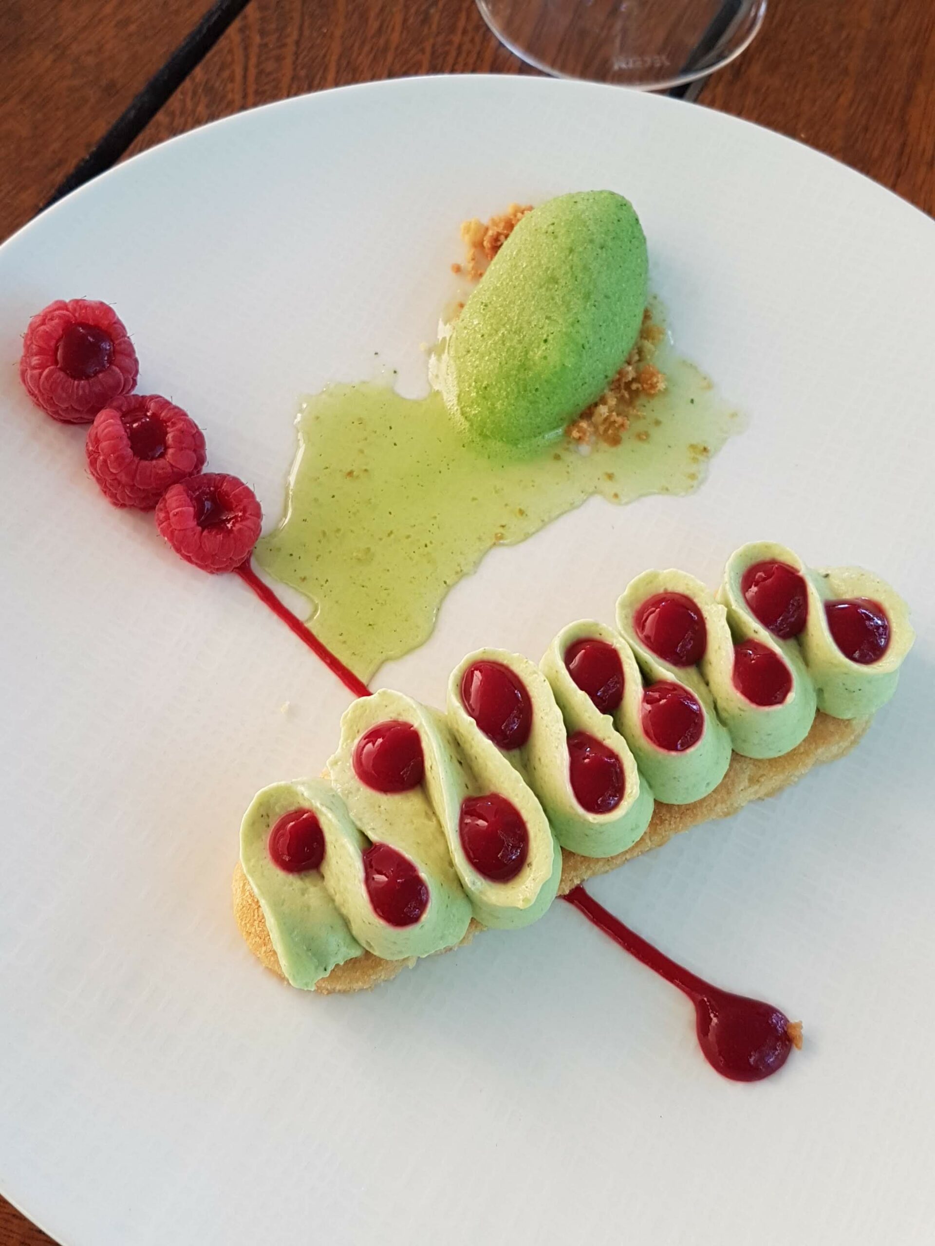 – Sablé framboise, crémeux pistache, sorbet basilic