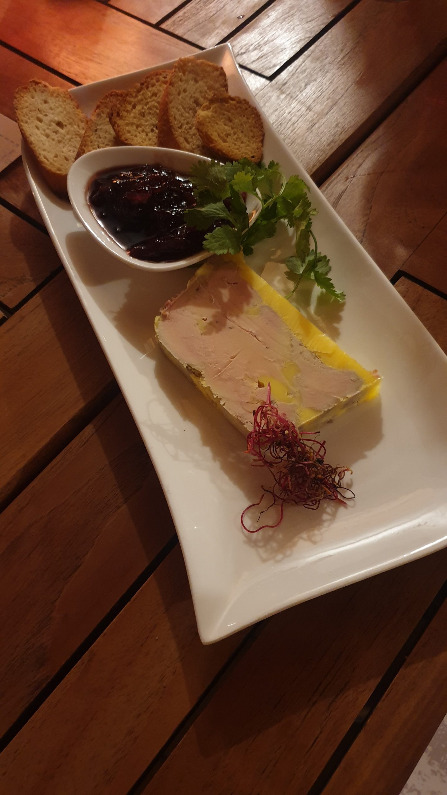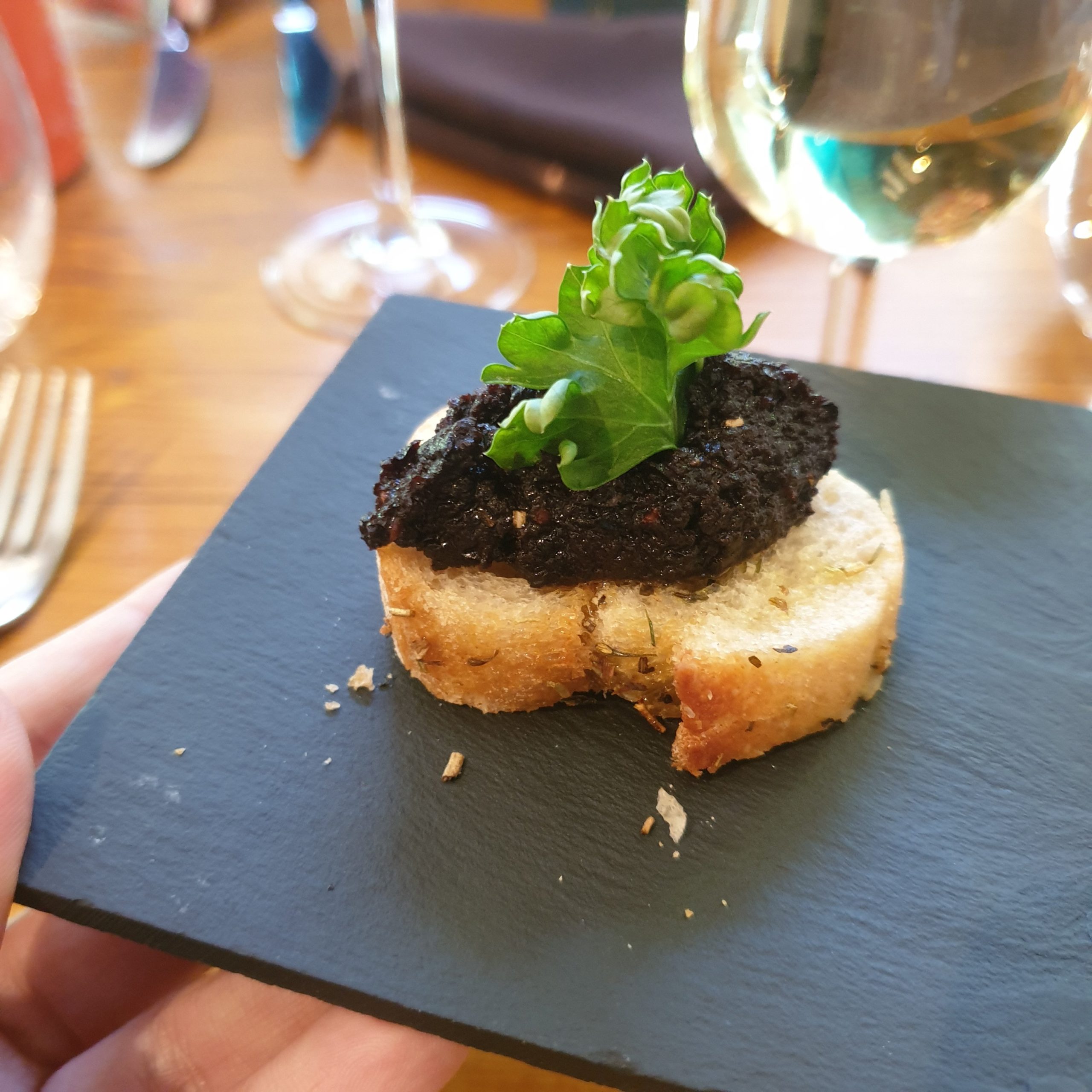 C’est au restaurant le Grain de Soleil, à quelques pas de la rivière qui traverse le village de Goudargues, que nous nous sommes rendus pour un déjeuner traditionnel. Après un petit toast de tapenade j’ai opté pour une raviole à la duxelle de champignons et foie gras poêlé en entrée, une cuisse de canard rôtie au coing en plat, puis du fromage de chèvre Pélardon accompagné de confiture de rhubarbe pour terminer le repas (plus team fromage que team dessert, sorry). Encore une fois, c’est dommage que le vent ne nous ait pas permis de profiter de la jolie terrasse. Mais sinon tout était très bon et assez copieux donc rien à redire sur cette adresse.