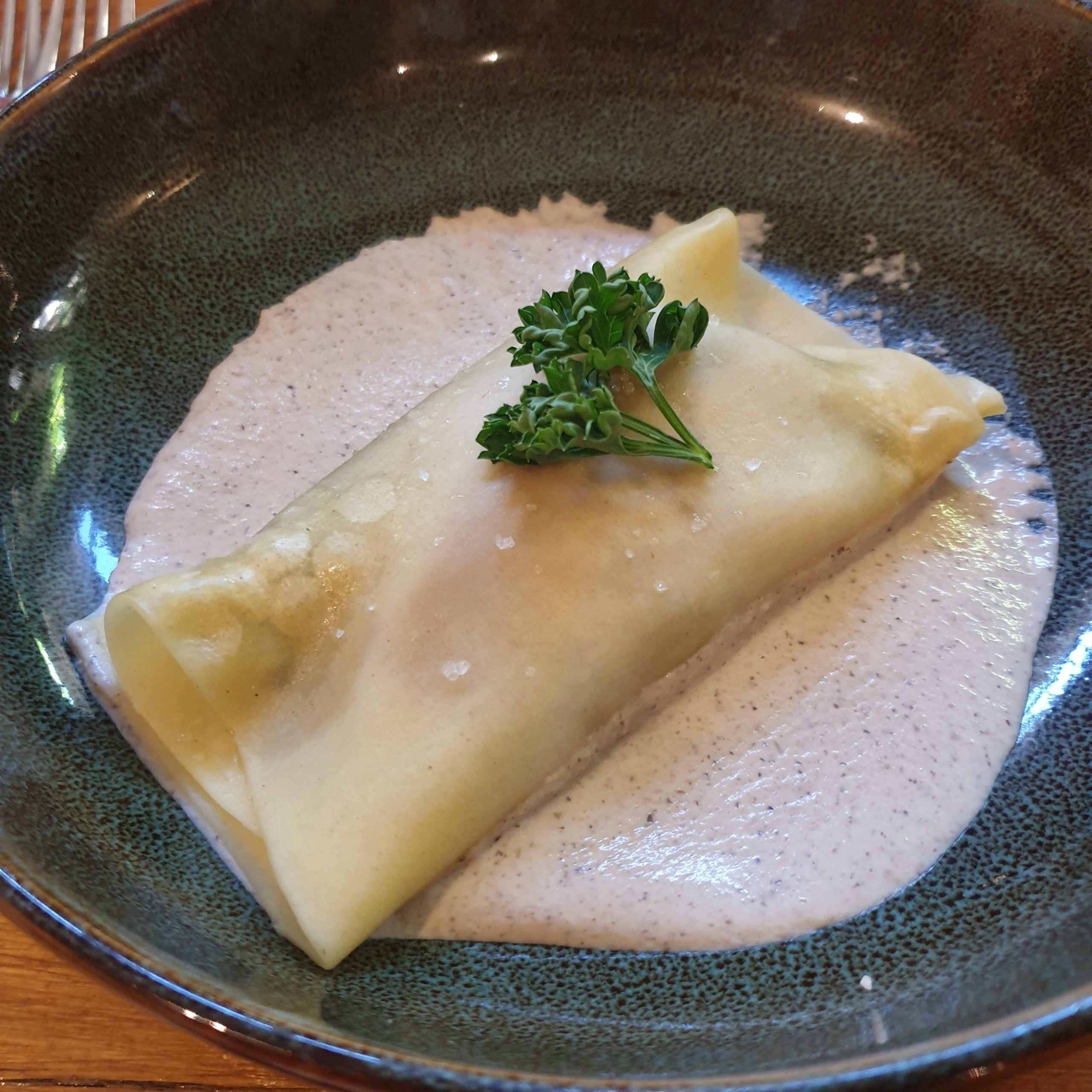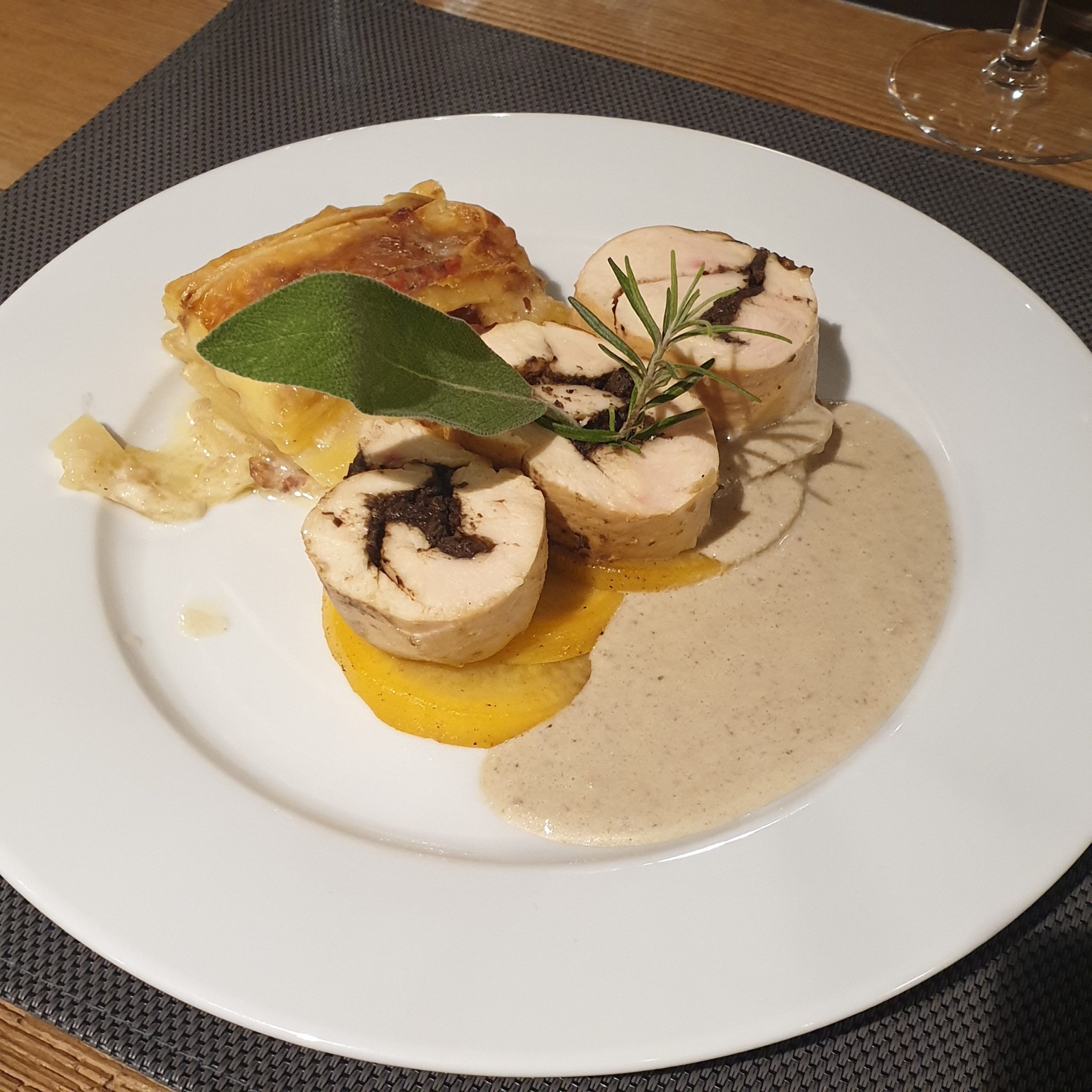 - Plat : ballotine de poulet farcie à la tapenade, choux colorés, navets boule d’or