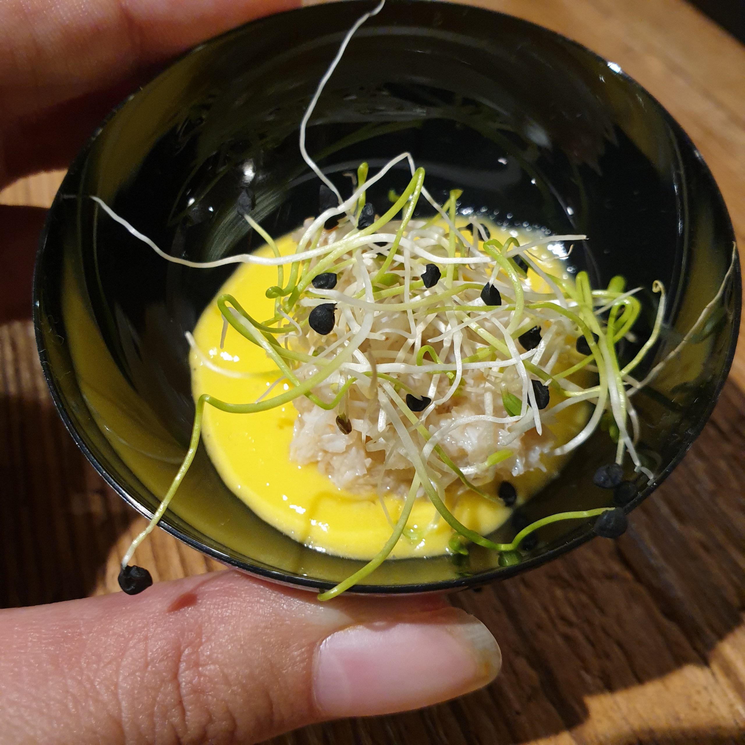 - Apéritif 2 : verrine de tourteau, jeunes pousses et vinaigrette à la mangue (j’étais sur cet atelier)